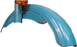 Early ural bikes and later combinations all have these high mounted mudguards made up of three individual pressings welded together to form two side seems. The guard hangs from the yoke and does not move. |